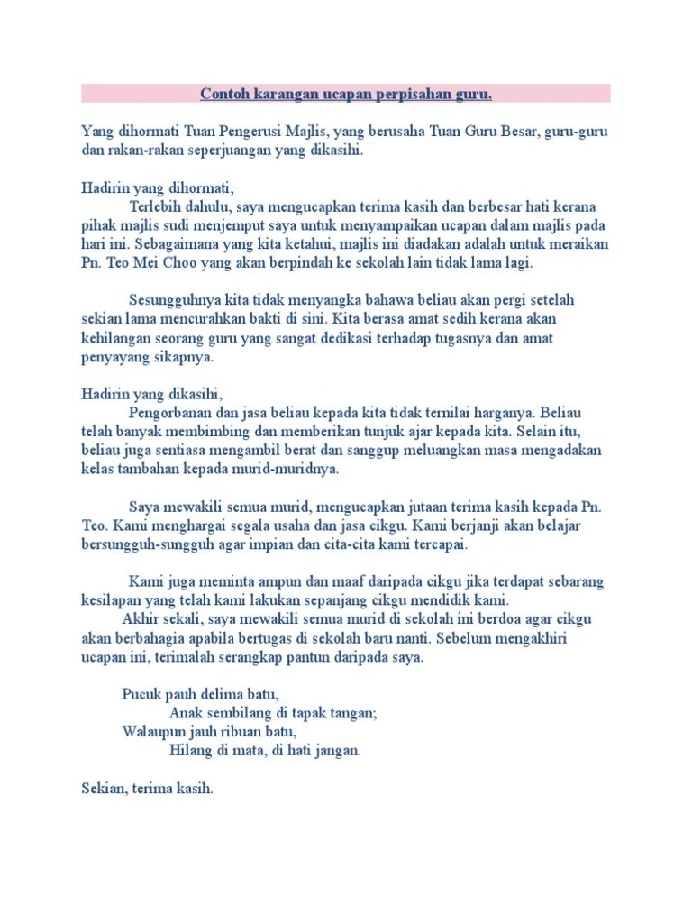 Karena seorang guru pun selalu mengajarkan kita untuk menghafal dan mengingat, bukan untuk . Kata kata perpisahan untuk guru yang akan pindah soal tuntas source: Guru bukan hanya mengajar kami, akan tetapi juga membimbing kami. Terima kasih bapak dan ibu guru, yang selalu sabar membimbing dan membekali berjuta ilmu pada kami, untuk kami menjadi generasi bangsa yang .